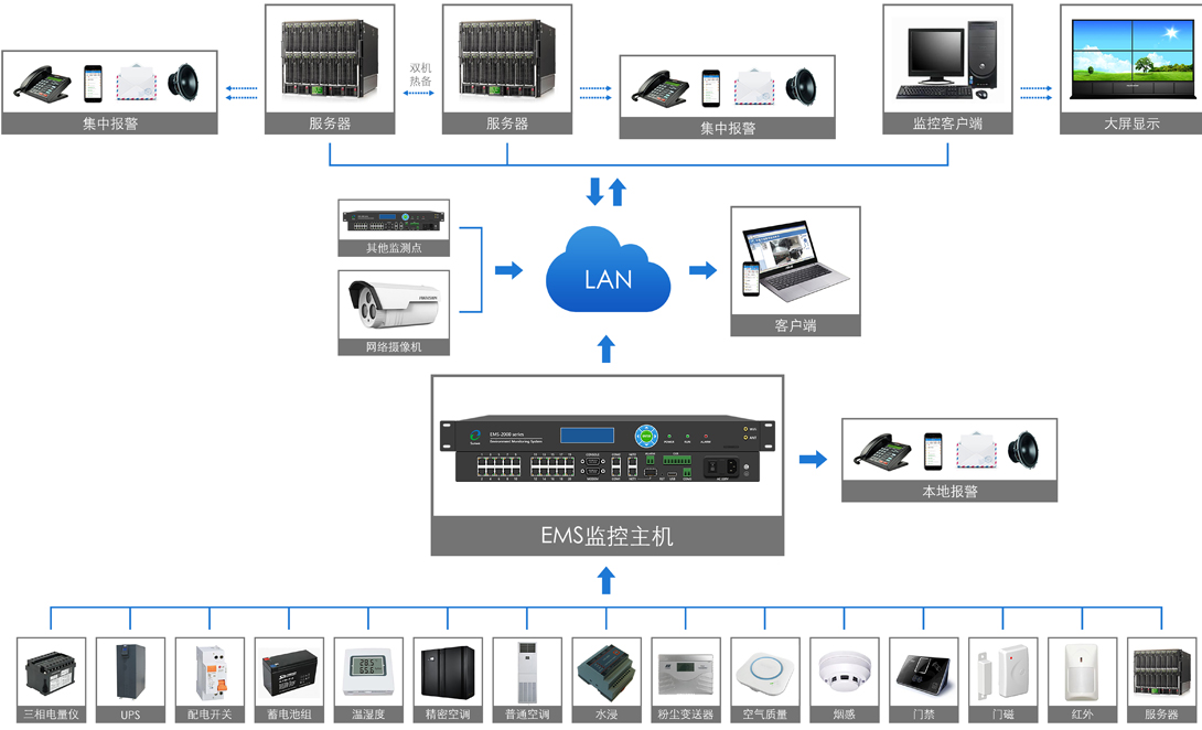 EMS系列監(jiān)控主機(jī)主要用以采集數(shù)據(jù)、處理數(shù)據(jù),可對環(huán)境、運行負(fù)載、設(shè)備溫升、局放工況、安防、視頻、消防、智能設(shè) 備等進(jìn)行一體化監(jiān)控。在實際應(yīng)用中,與不同類型的傳感器相連,布線簡潔,操作方便。
